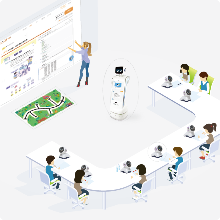 · 개인교육용 파이봇(PYBOT), 퓨쳐쌤, 보조교사 로봇(UCA), 전자칠판이 융합된 교실 경험 제공