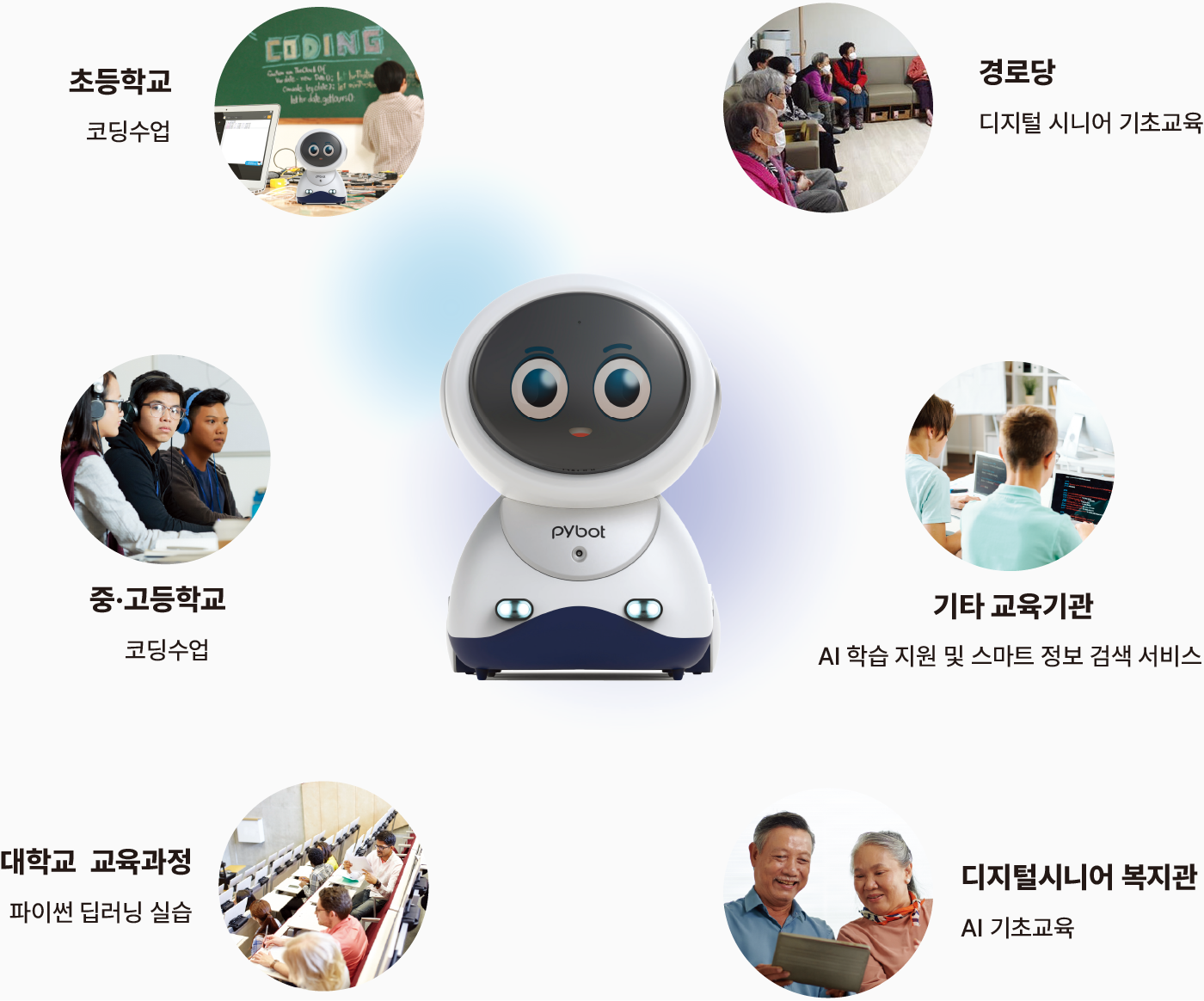 AI PYBOT은 초·중·고등학교부터 대학 교육과정, 시니어 복지관까지 다양한 현장에서 활용됩니다. 코딩 수업, AI 기초학습, 맞춤형 학습 지원 등 연령과 수준에 맞는 폭넓은 교육 솔루션을 제공합니다.